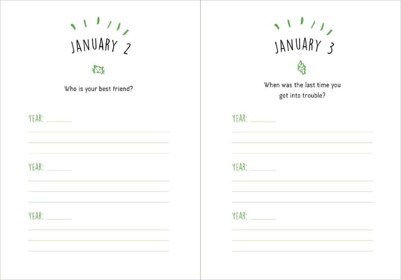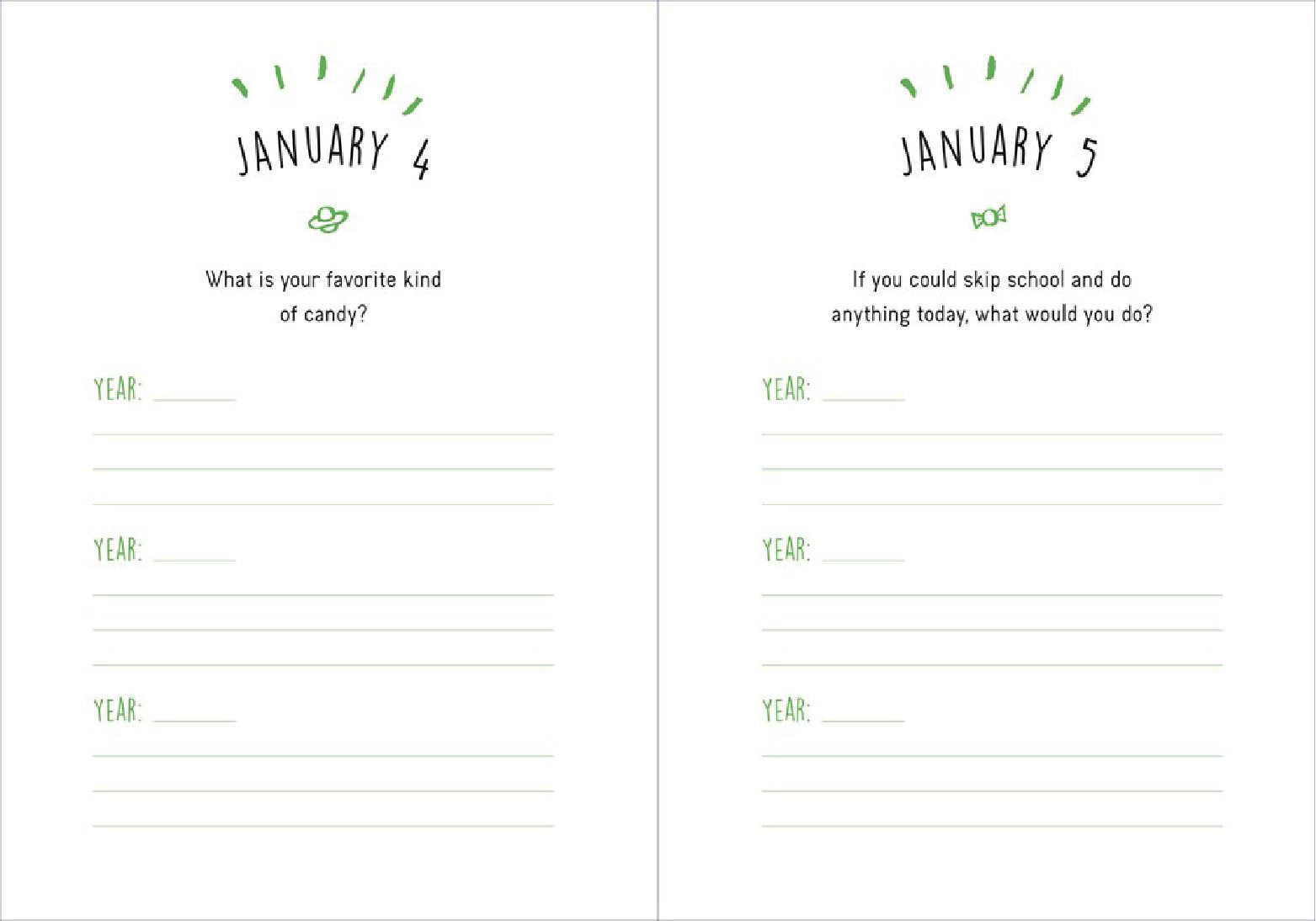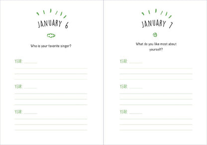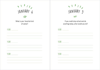 One Question a Day for Kids is a guided journal with fun and thoughtful questions for each day of the year. By answering the same question every day for three years, children will be able to see how their thoughts, creativity, and even handwriting changes from year to year. Prompts are short and sweet, allowing kids to answer as concisely (or elaborately) as they want.